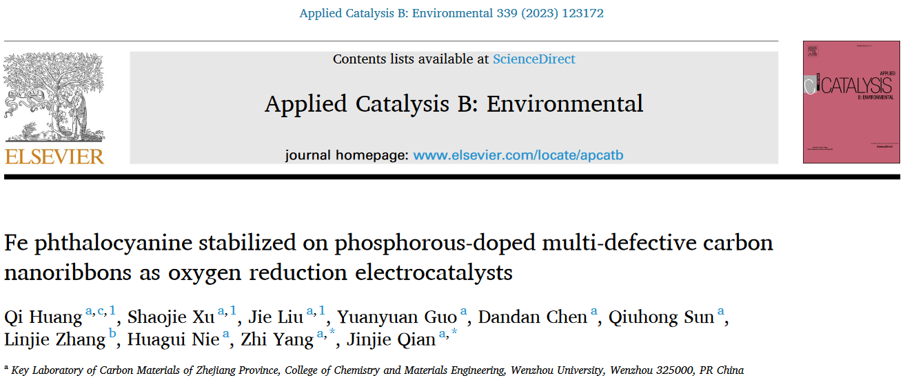 本论文以“Fe phthalocyanine stabilized on phosphorous-doped multi-defective carbon nanoribbons as oxygen reduction electrocatalysts”为题发表在《Applied Catalysis B: Environmental》上,2023年影响因子22.1。国产自拍为第一通讯单位,国产自拍 化学与材料工程学院钱金杰副教授和杨植教授为通讯作者,化学与材料工程学院2019级硕士研究生黄淇、2021级硕士研究生徐少杰和2022级硕士研究生刘捷为共同第一作者。该工作受到国家自然科学基金(21601137)、浙江省自然科学基金(LQ16B010003)、浙江省温州市基础科技研究项目(H20220001)、中国科学院结构化学国家重点实验室项目(20190008)和云南省地方本科高校基础研究联合专项资金项目(202101BA070001-042)的资助。