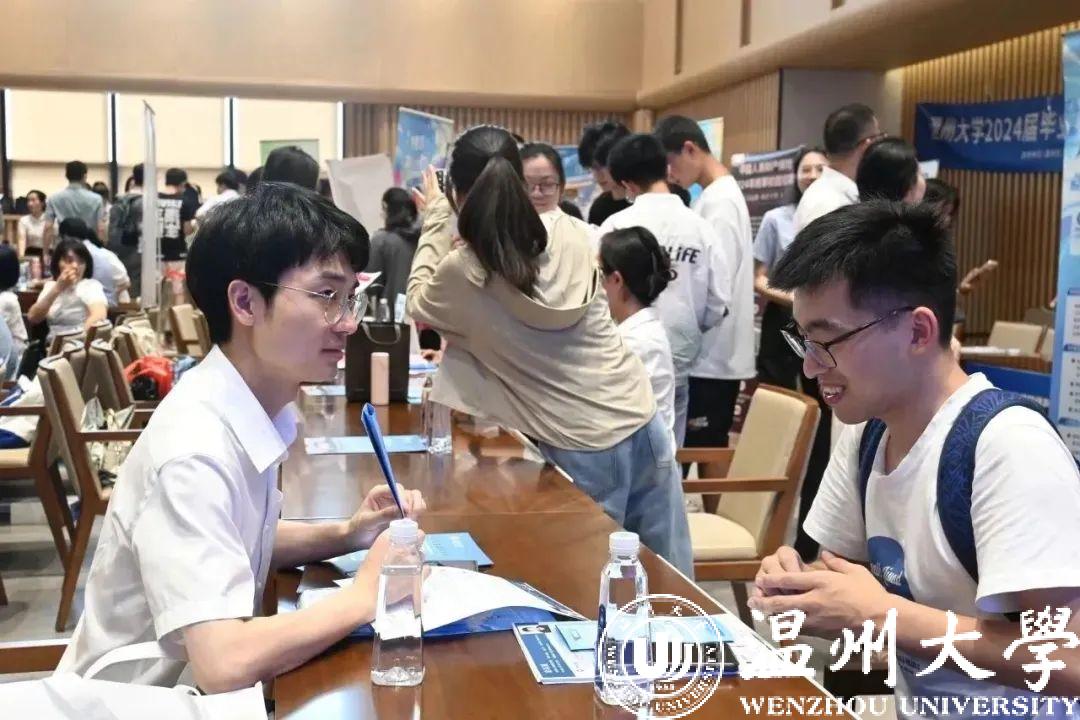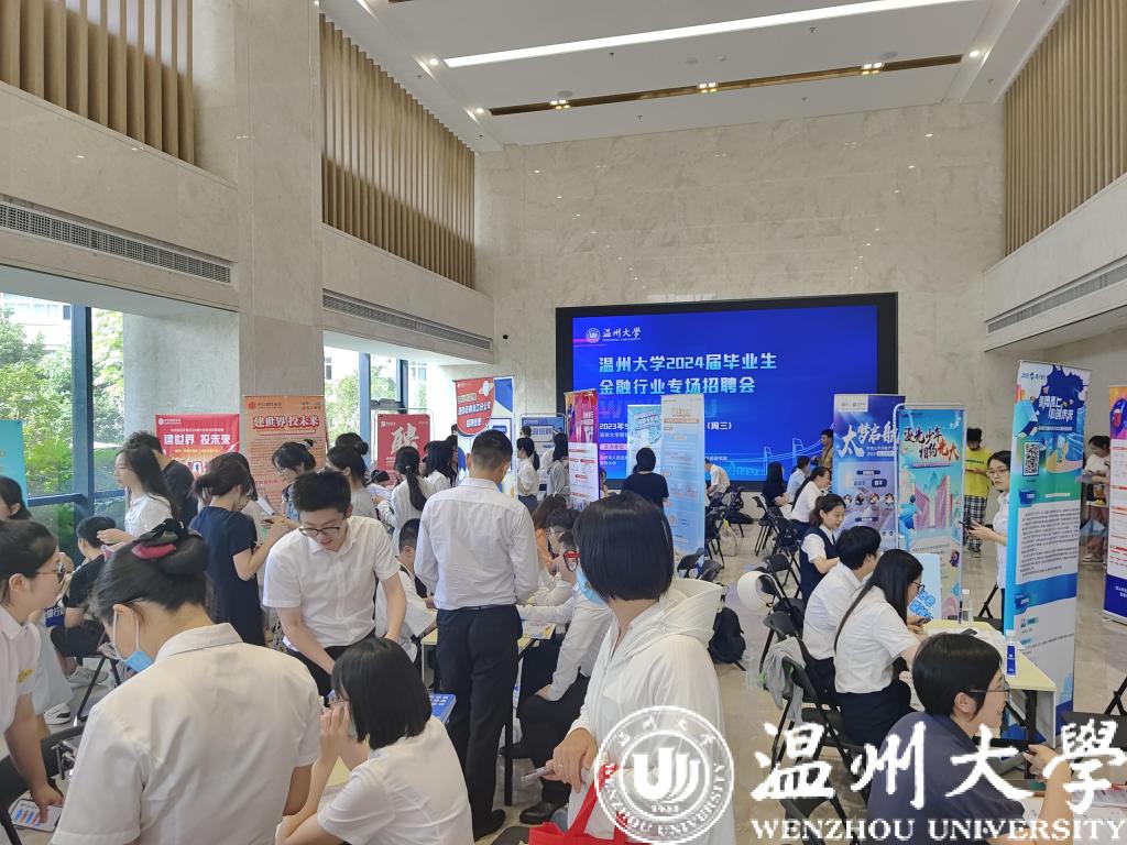 为了更好地满足2024届毕业生和金融行业用人单位秋季招聘需求,搭建有效的洽谈平台,拓宽国产自拍 求职就业渠道,9月20日下午,“金彩人生 职等你来”金融行业专场招聘会于国产自拍南校区科技综合大楼顺利举办。在温州市人民政府金融工作办公室的大力支持下,本次招聘会云集了国有六大银行,申万宏源、上海证券、中信证券、中国人寿、泰康人寿等金融行业53家头部企业参会,提供了1700多个高质量的就业及实习岗位,堪称一场含“金”量超高的招聘会。