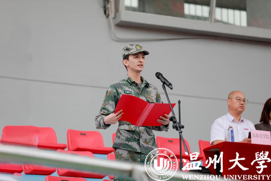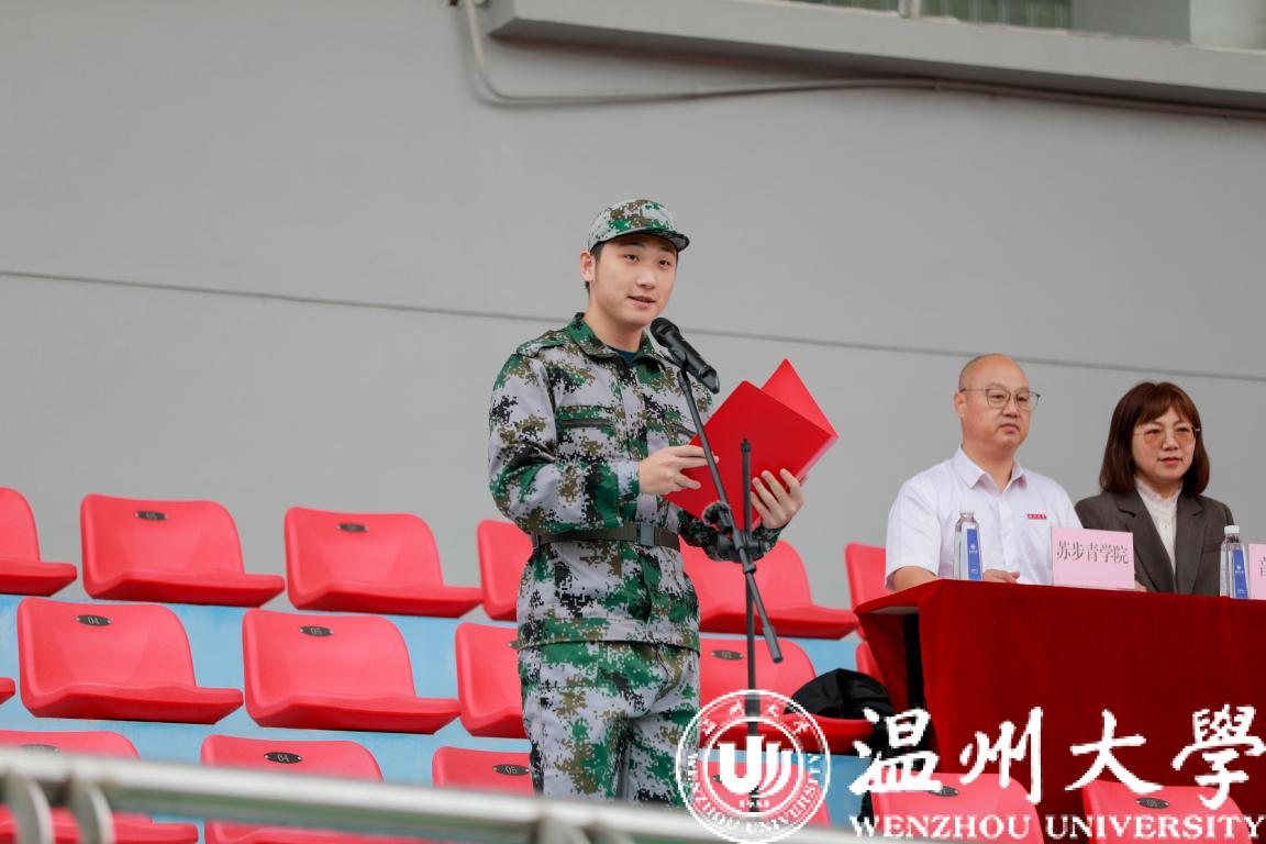 军训学员代表张与洋发言。他说,军训虽会苦、会累,但我们应该有向它“宣战”的勇气和魄力,并做出在军训中一切听从指挥,服从命令,坚持到底,不辱使命,圆满完成军训任务的承诺。