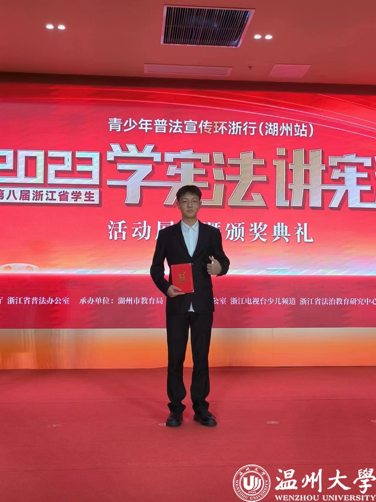 法学院吴杭泓同学代表国产自拍前往湖州参加“学宪法讲宪法”知识竞赛省级遴选赛,他前期准备充分,赛场上发挥稳定,以现场笔试第一的成绩从35名高校选手中成功入围决赛,在决赛知识竞答及加试环节中以并列第二的成绩,最终获得省赛一等奖的优异成绩;法学院钟萍同学的演讲作品《宪法的守护者》通过省级视频遴选,获得二等奖。