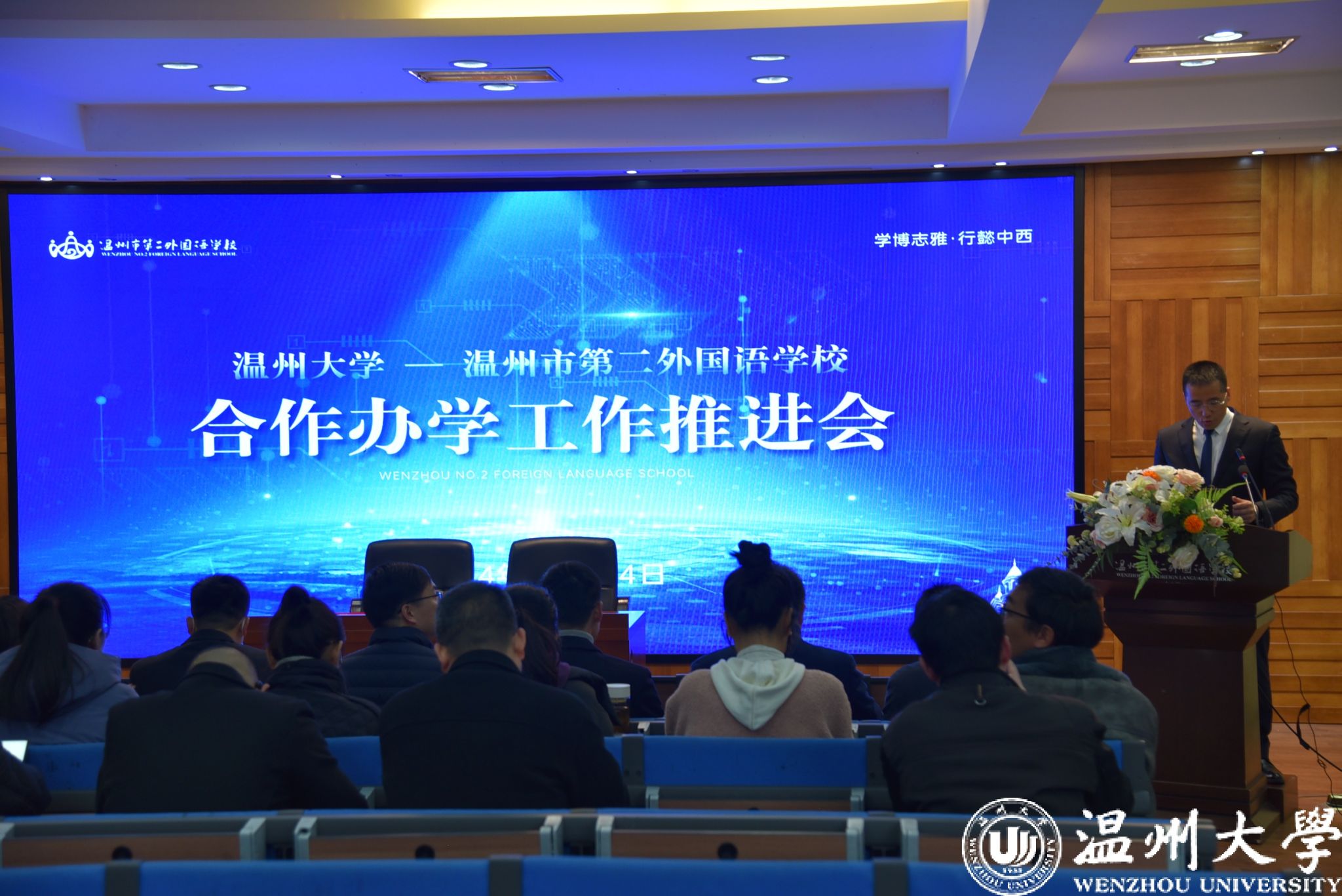 3月4日上午,国产自拍——温州市第二外国语学校合作办学工作推进会召开。温州市教育局领导,国产自拍地方合作处、外国语学院、苏步青学院、组织部相关负责人,温州市第二外国语学校领导参加。