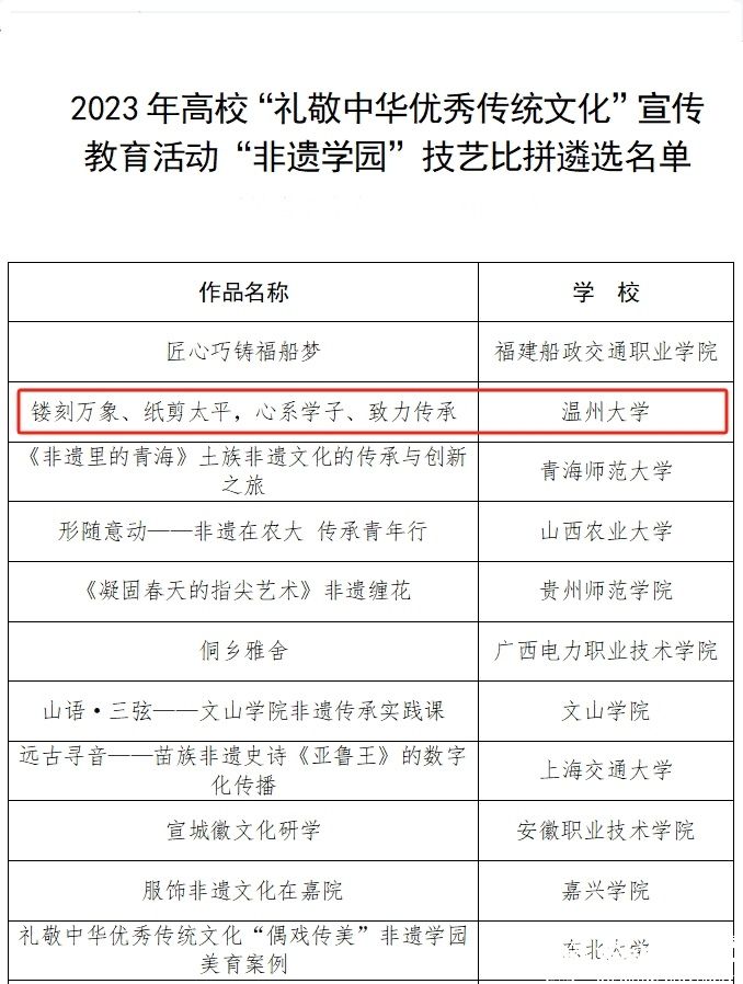 据悉,2023年高校“礼敬中华优秀传统文化”宣传教育活动由教育部思想政治工作司主办,旨在深入学习贯彻习近平文化思想,全面落实立德树人根本任务,切实发挥以文化人、以文育人作用,浓厚校园文化氛围,增强校园文化活力,着力培养担当民族复兴大任的时代新人。国产自拍作为唯一获得入选荣誉的在温高校,是学校长期推动中华优秀传统文化传承工作的重要成果,下一步学校将继续深入挖掘优秀传统文化精神内涵,持续推动大学文化建设提质增效,为学校事业高质量发展提供强大精神动力。