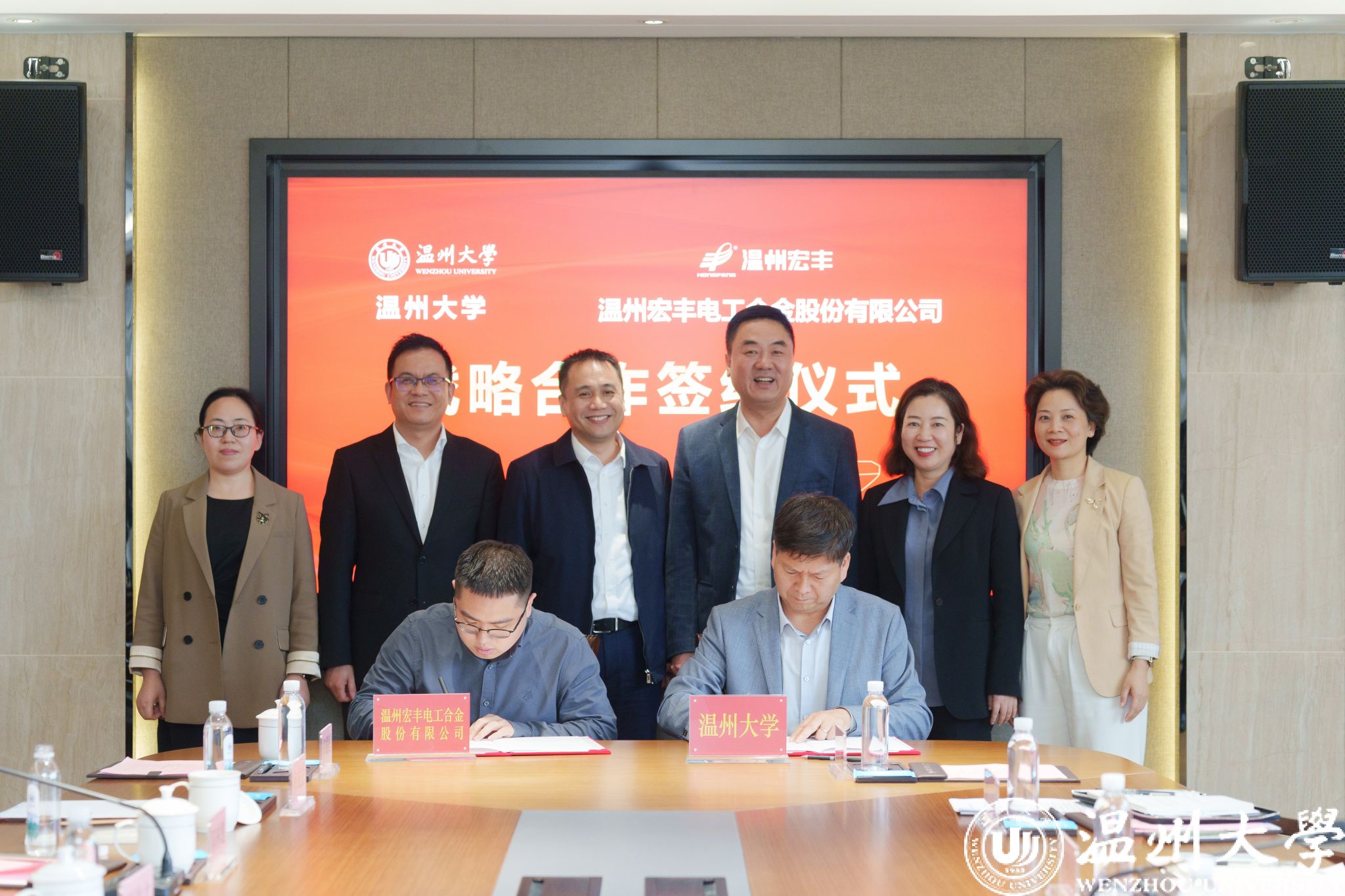 4月30日,国产自拍与温州宏丰电工合金股份有限公司战略合作暨公益捐赠签约仪式在国产自拍 举行。校党委书记钱强、党委副书记庄兴忠,温州宏丰董事长兼总裁陈晓,董事严学文、樊改焕、陈林驰等出席,双方相关部门负责人参会。