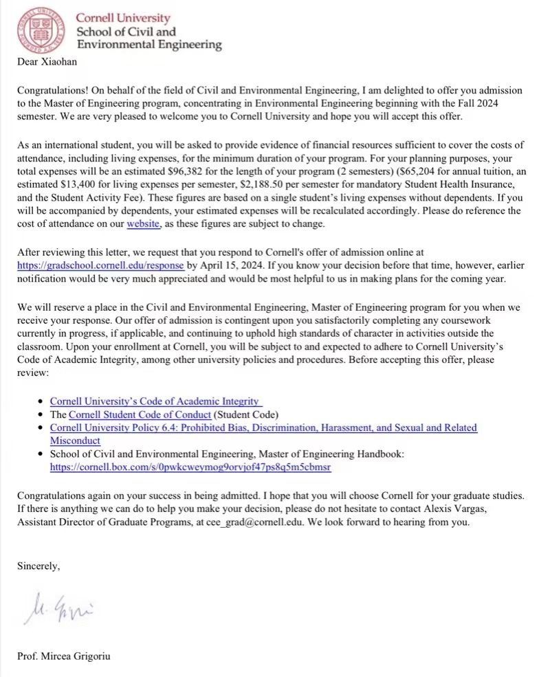 近日,温州大国产自拍 命与环境科学学院2024届环境工程专业毕业生周校含斩获西北大学(NU)、杜克大学(DU)、加利福尼亚大学(UCLA)、约翰斯·霍普金斯大学(JHU)、华盛顿大学(UW)、圣路易斯华盛顿大学(WU)、康奈尔大学(Cornell)、卡内基梅隆大学(CMU)等8所世界名校的11封录取通知书。这些学校的世界排名都在第10-60位之间,属于世界顶尖名校。经过深思熟虑后,周校含最终选择了康奈尔大学(Cornell University)。