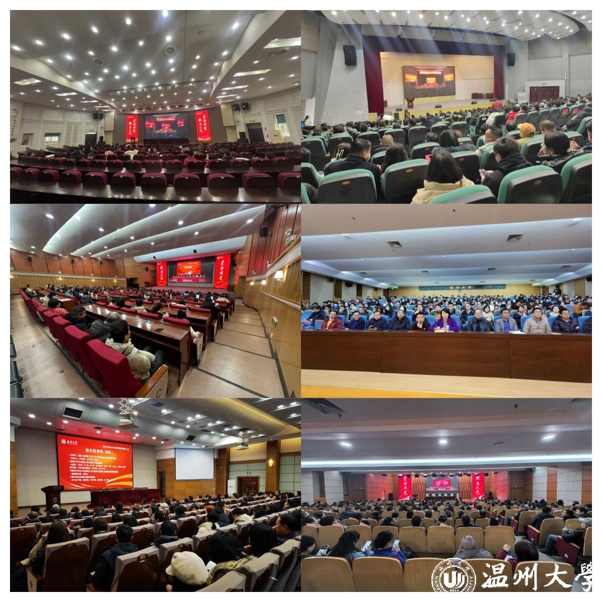 本次大会采取“现场+同步直播”的方式,除育英大礼堂主会场外,还设置了岩松堂雁山厅、岩松堂步青厅、南校区9号楼报告厅等6个分会场同步直播,学校全体教职工参加会议。