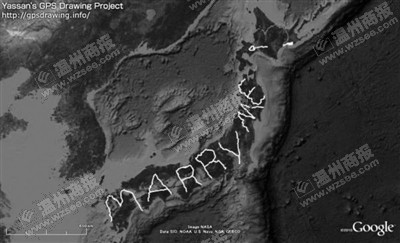 不过,高桥靖的地图暗藏玄机,事先规划好路线用GPS记录,再把走过的足迹放到Google地图上一一连线,最后呈现出英文字母“MARRY ME”,并附上一箭穿心的图案,这才揭开这次旅行最大的目的——向女友求婚。