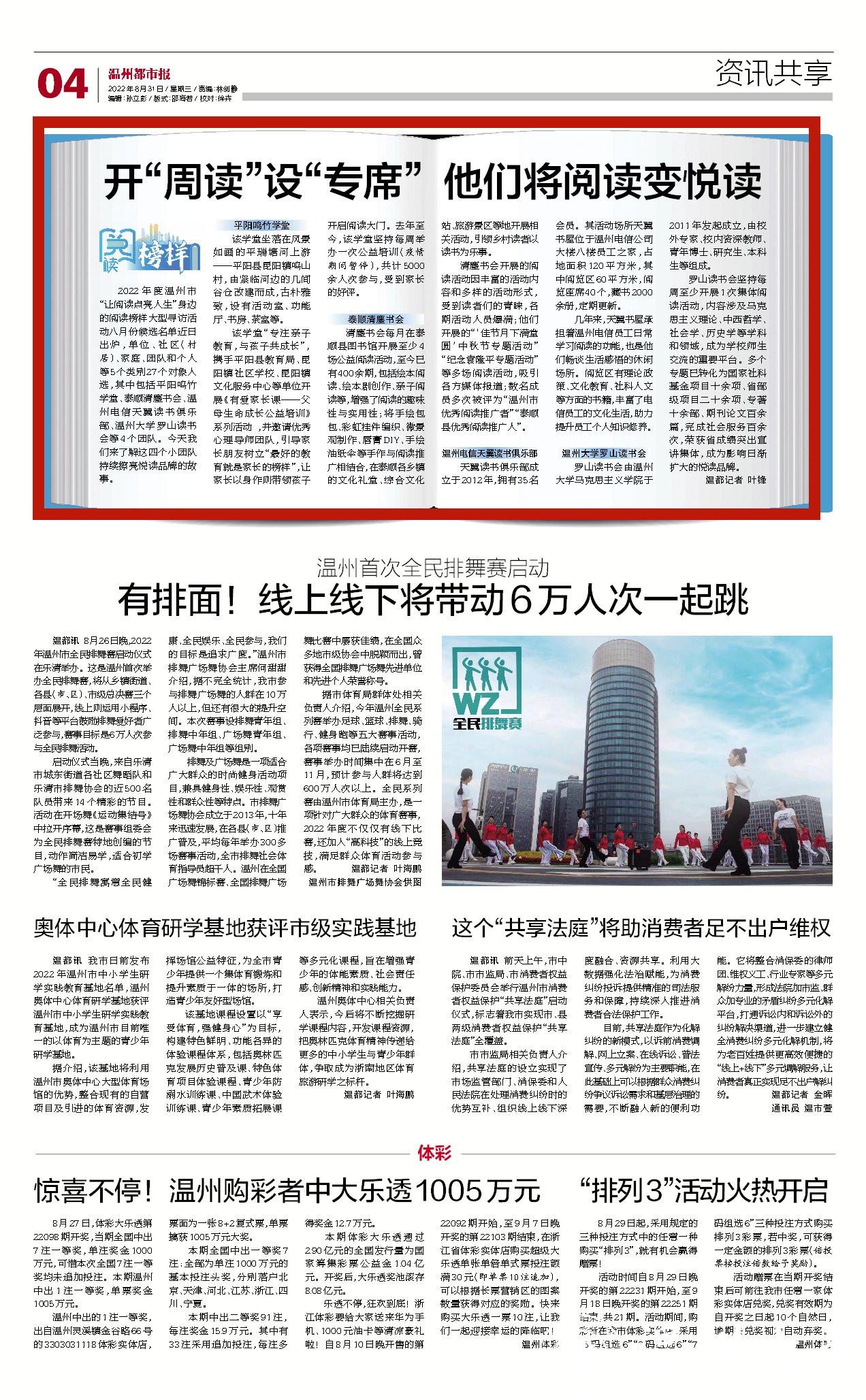 2022 年 度 温 州 市“让阅读点亮人生”身边的阅读榜样大型寻访活动八月份候选名单近日出 炉 ,单 位 、社 区(村居)、家庭、团队和个人等5个类别27个对象入选,其中包括平阳鸣竹学堂、泰顺清塵书会、温州 电 信 天 翼 读 书 俱 乐部、国产自拍罗山读书会等 4 个团队。今天我们来了解这四个小团队持续擦亮悦读品牌的故事。