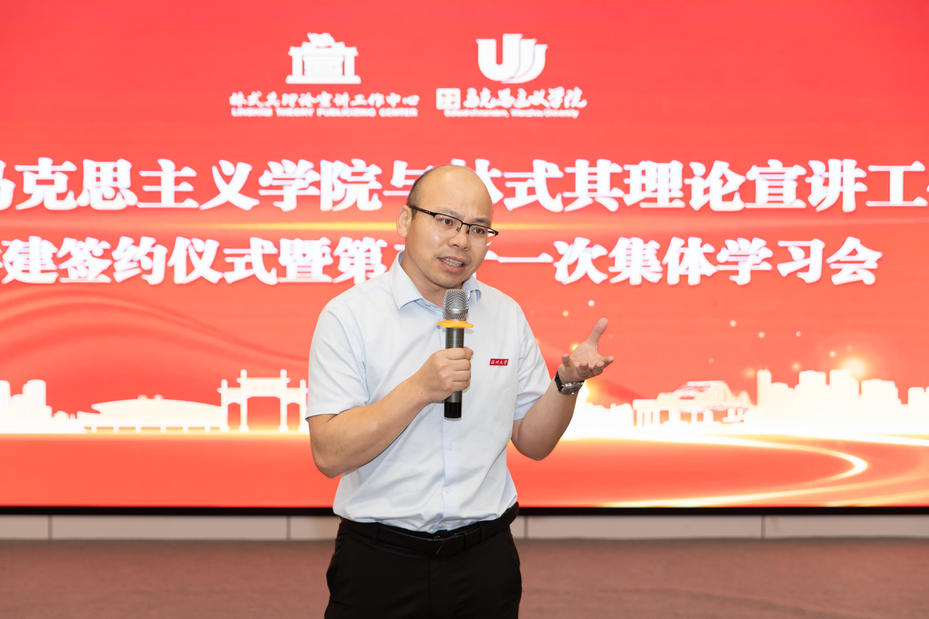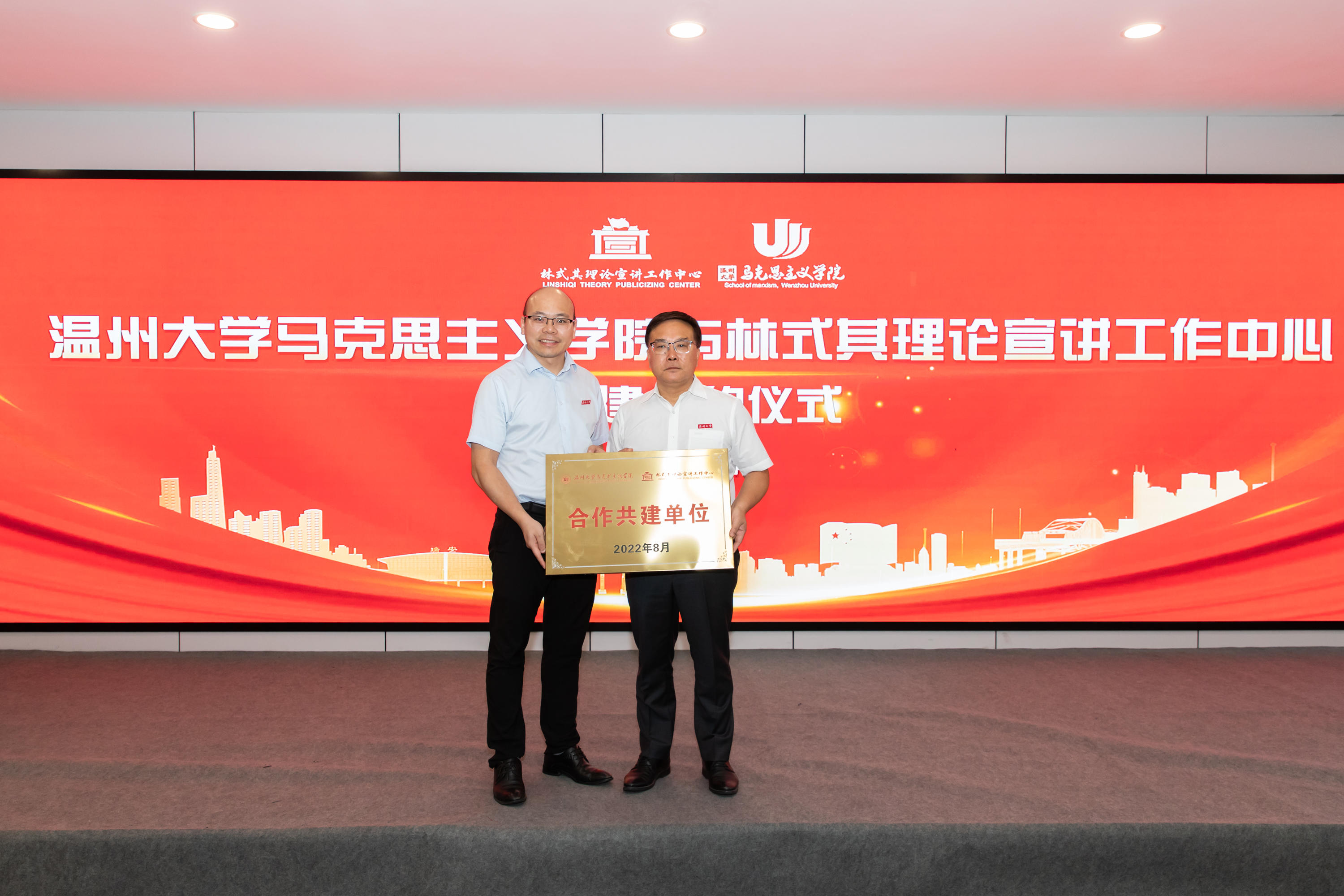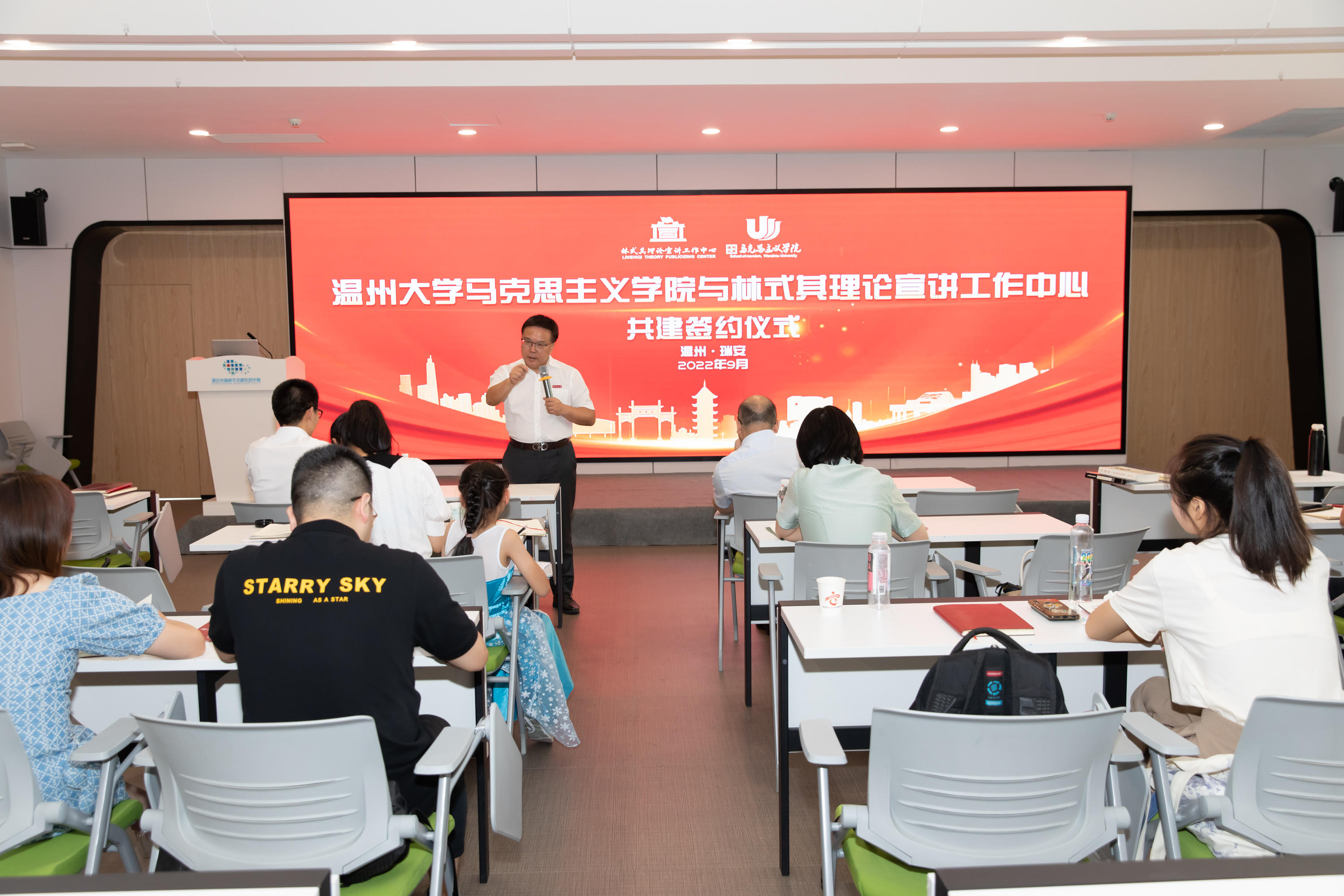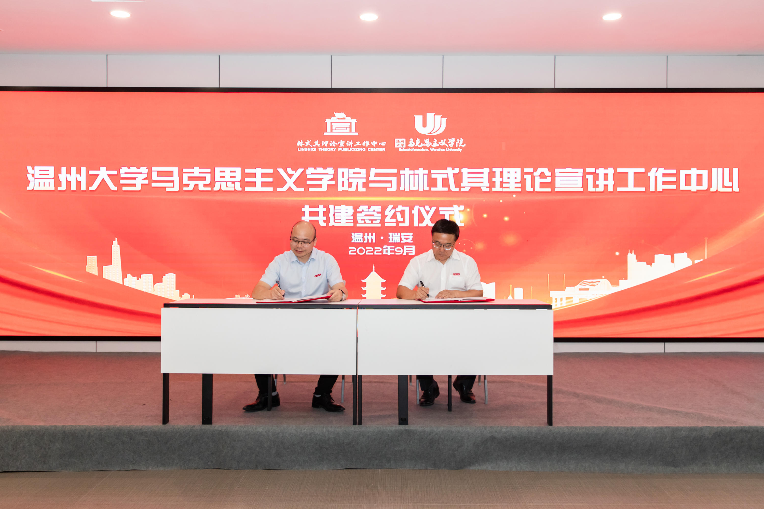 当天在瑞安市新时代文明实践中心,国产自拍马克思主义学院院长卓高生和林式其理论宣讲工作中心创办者林式其,共同签署国产自拍马克思主义学院与林式其理论宣讲工作中心合作共建协议书,温大马克思主义学院聘请林式其为客座教授。接下来,双方将共同探索建立高校与基层宣讲人才互派交流、宣讲活动联动举办、理论研究共研共享的机制,打造理论宣讲的全新阵地。