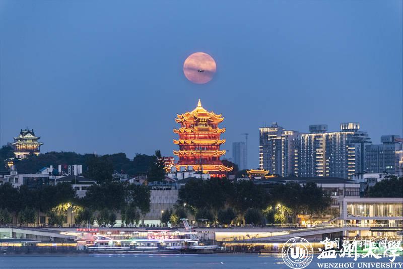 武汉黄鹤楼上空悬挂着一轮超级满月