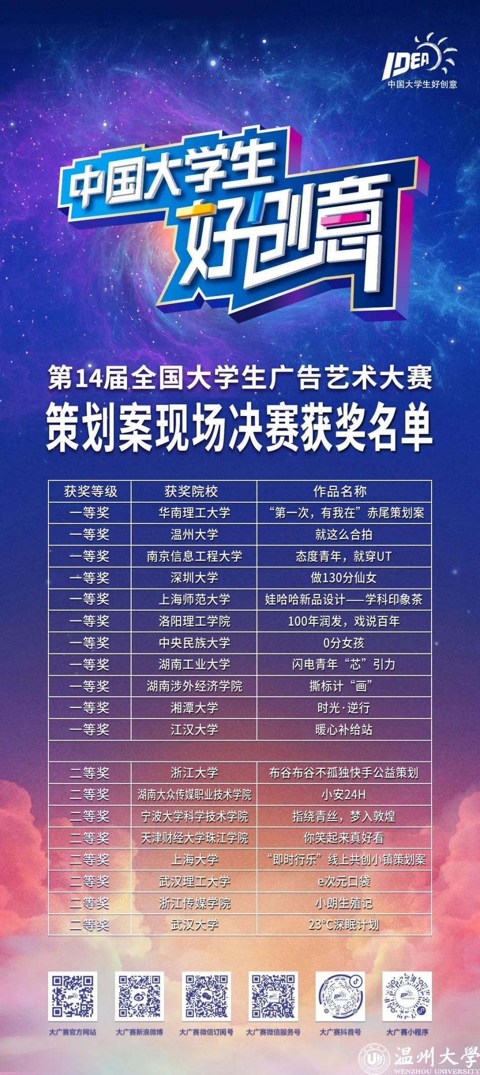 感谢各位领导、专家评委、企业嘉宾对大广赛一如既往的支持!感谢第14届大广赛命题企业:平安银行、朗圣药业、HBN、娃哈哈、即时设计、《时尚芭莎》电子杂志MiniBAZAAR、元气森林出品纤茶、Canva可画、优衣库、爱华仕箱包、快手、999感冒灵、XPPen、云南白药养元青、美颜相机、纳爱斯集团旗下的100年润发品牌、纳爱斯品牌,以及喜临门品牌对广告教育的贡献!感谢所有参赛师生,愿你们一路成长高歌,所向披靡,奔赴创想之约!