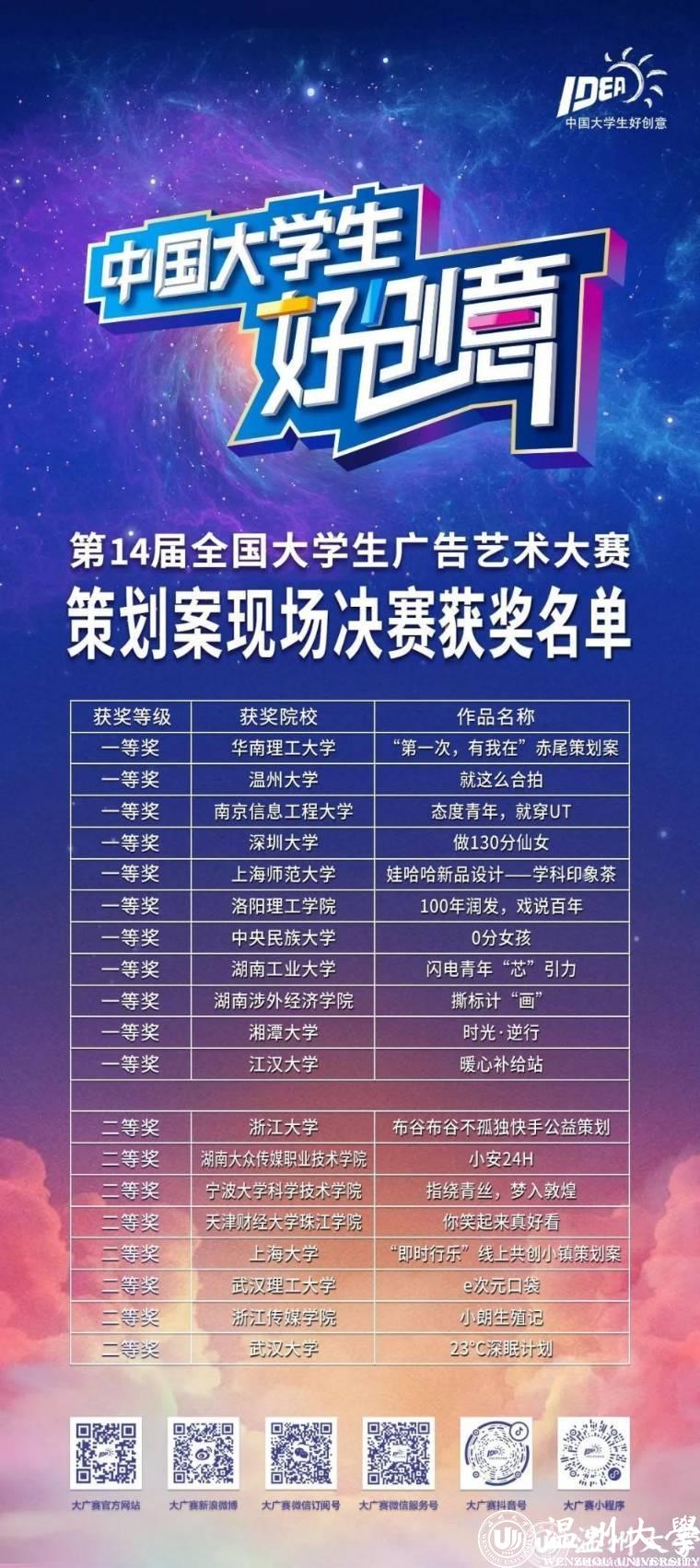 大广赛策划案类别比赛是全国大广赛中门类最复杂、要求最高的比赛类型,我院学子在该类型赛事上一向表现卓越,每一年都有策划案类别的全国等级奖项,今年除了决赛而出的《就这么合拍》一等奖,还有《中国可乐有“股气”》《现充青年》两项二等奖和《“银发冲浪”计划》等五项全国优秀奖。愿诸位学子以他们为榜样,秉持“十年磨一剑”的精神,博观而约取,厚积而薄发,收获绚烂青春,成为自己的无冕之王!
