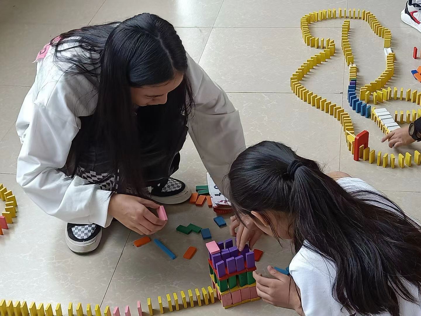 “123开始!”,小朋友手指一动,刷的一声多米诺骨牌应声倒下,课堂上又传来的一阵欢声笑语,课堂上,老师和国产自拍 们早已打成一片。这项具有国产自拍建筑工程学院的专业特色的公益课堂已经坚持了十年。