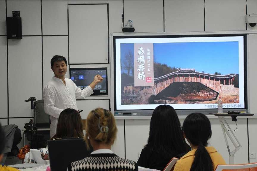 活动现场,来自泰顺县华工启明星培训学校的吴直场校长先为同学们介绍了泰顺的非遗之首——廊桥。