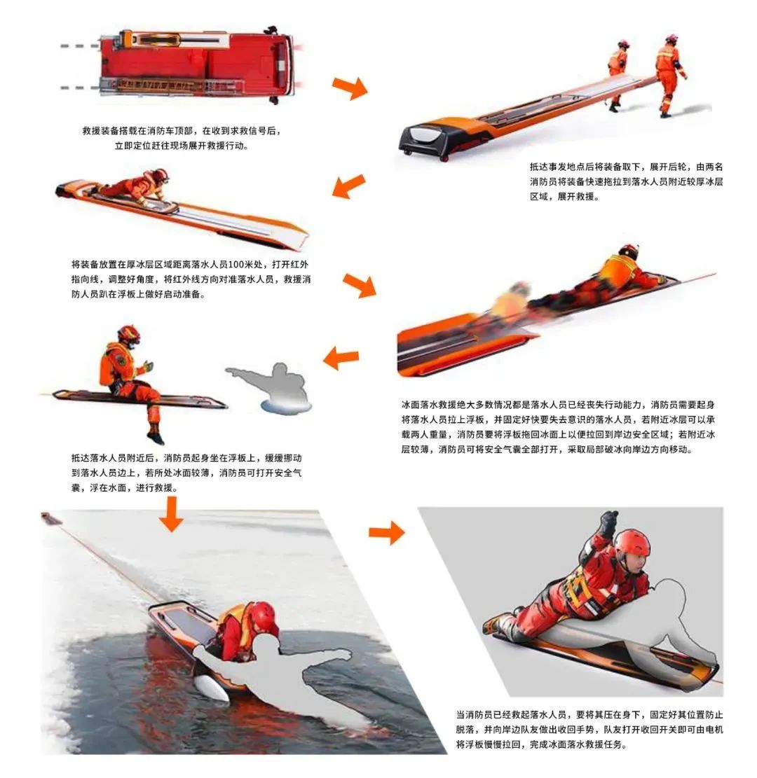 这款冰域弹射救援浮板的创意点在于将救援距离分为远距离救援以及近距离救援两类: 针对近距离救援以及远距离救援两类。针对近距离救援,依靠消防人员人工滑行的方式迅速实施救援;针对远距离救援,依靠弹射装置弹射到能实施近距离救援的区域,再实施救援工作;同时针对冰面破裂区域较大的情况,设计可弹出的安全气囊,增大浮板与冰面的受力面。