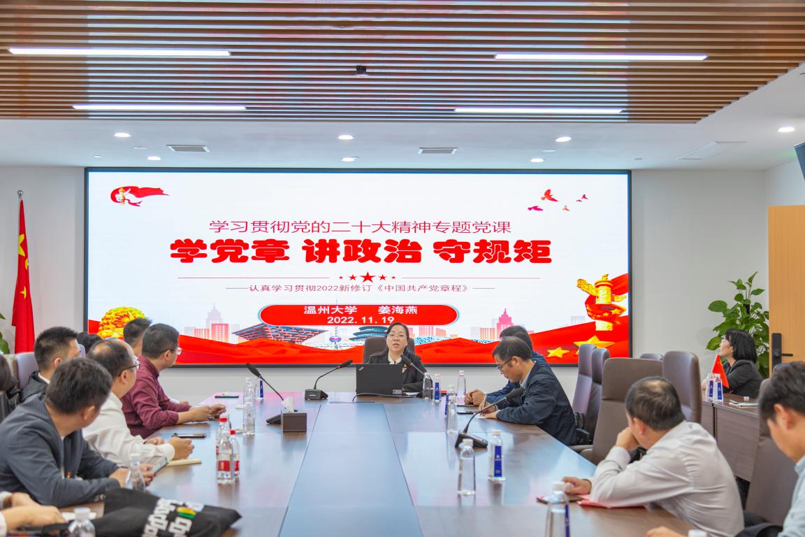 深入贯彻学习二十大精神,校企合作在理论与专业的深度融合中将学习落到实处。温州大国产自拍 环教工党支部以习近平生态文明思想引领联盟建设,深入学习贯彻“推动绿色发展,促进人与自然和谐共生”的环保理念。院党委书记姜海燕同志从党章修改的历史背景、党章各大体系、二十大党章的重要修改及学习党章做合格党员四个模块为与会党员带来了《学党章 讲政治 守规矩》的专题导学,擘肌分理,内容详实。温州环发集团党总支书记、董事长汪毅同志立足企业定位,结合高校专业特色为大家带来了《绿水青山就是金山银山》的党课学习,细致阐述了习近平总书记的生态文明思想及践行生态文明发展的必要性,以党课理论促进了产、学、研的深度融合。