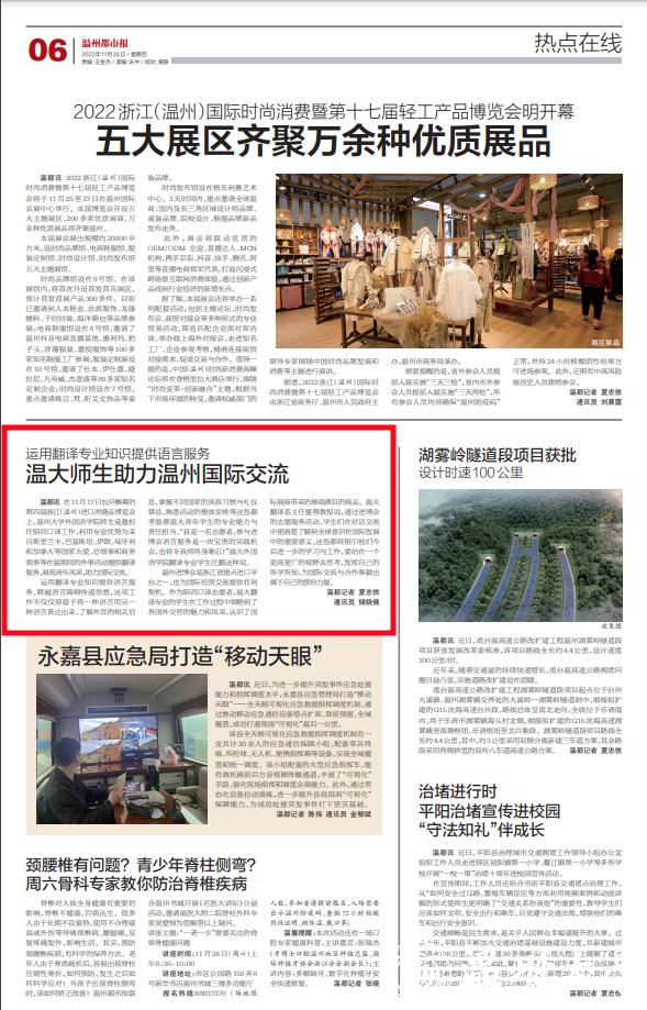 在11月17日拉开帷幕的 第四届浙江(温州)进口消费品博览会 上,国产自拍外国语学院师生受邀担 任陪同口译工作,利用专业优势为来 自斯里兰卡、巴基斯坦、伊朗、匈牙利 和加拿大等国家大使、总领事和商务 领事等在温期间的外事活动提供翻译 服务,展现青年风采,助力国际交流。