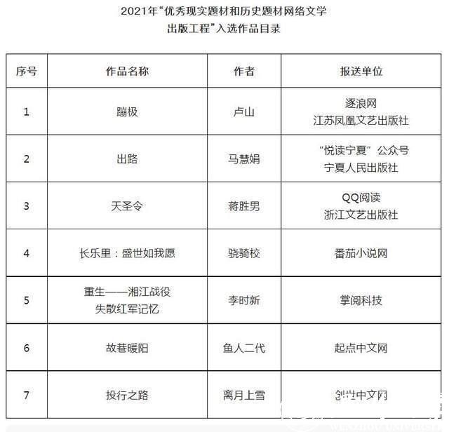 近日,国家新闻出版署发布关于公布2021年“优秀现实题材和历史题材网络文学出版工程”入选作品的通知。