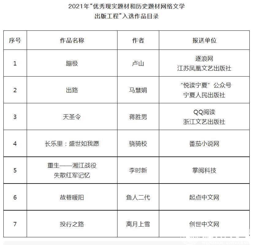 近日,国家新闻出版署发布关于公布2021年“优秀现实题材和历史题材网络文学出版工程”入选作品的通知。