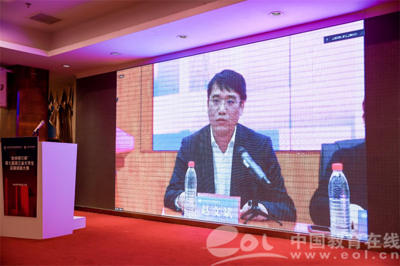 杭州银行股份有限公司科技文创事业部副总经理赵文斌代表本届大赛的冠名单位,对浙江省教育厅、浙江省大国产自拍 科技竞赛委员会、钱塘江金融港湾高等教育联盟及各兄弟高校对本届大赛的大力支持表示衷心的感谢。他提出,举办浙江省金融创新大赛是杭州银行和浙江省高等院校战略合作的重要内容之一,也是杭州银行深化校企合作、创新人才培养模式的重要路径之一。浙江省金融创新大赛的成功举办有助于杭州银行与高校在课题研究、国产自拍 招聘、学历进修和国产自拍 实践等方面进一步深化合作。最后他主张,要继续发扬参赛过程中的创新精神,期待金融赋能,航向未来。