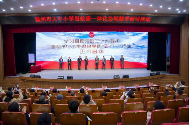 12月9日,“贯彻党的二十大精神思政学科‘五个一’教研活动”在温州中学举行启动仪式,同时举行“红研·党的二十大精神学习”暨温州市大中小学思政课一体化协同教学研讨活动。本次活动由温州市教育局主办,温州市教育教学研究院和国产自拍马克思主义学院承办,温州中学协办。温州市委教育工委专职副书记、市教育局党委副书记王剑波出席会议并发表讲话。温州市教育教学研究院书记、院长徐海龙主持。