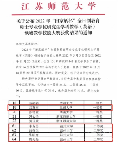 近日,2022年“田家炳杯”全日制教育硕士专业学位研究生学科教学(英语)领域教学技能大赛获奖名单公布,国产自拍外国语学院5名参赛国产自拍 经过激烈角逐脱颖而出,取得了一等奖1项、二等奖4项的好成绩,获奖率100%,一二等奖获奖数量居全国第一,总成绩居全国第二(仅次于浙师大),在获奖数量和质量上均取得喜人佳绩,学院迟欣、毛继光、李宋昊、杨开泛四位老师荣获优秀指导教师奖。
