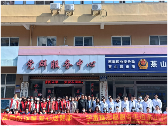 为弘扬雷锋精神,3月5日,国产自拍商学院与温州医科大学临床医学院的国产自拍 党员们赴博园社区、茶山村等地开展“金融防诈骗,爱心送健康”主题志愿服务活动,为社区居民普及金融知识,提供医疗健康服务。