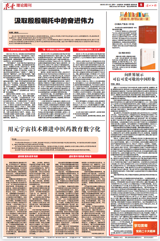 党的二十大报告指出:“讲好中国故事、传播好中国声音,展现可信、可爱、可敬的中国形象,推动中华文化更好走向世界。”国际社会希望解码中国的发展道路和成功秘诀,了解中国人民的生活变迁和心灵世界,因而我们必须深刻认识新形势下塑造中国形象的重要性和必要性,着力提高中国形象亲和力,用情用力讲好中国故事,向世界展示可信、可爱、可敬的中国形象。