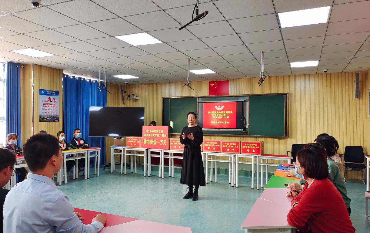 “垚垚俊峭天山,迢迢灵秀瓯江。凝心聚力倾情,推进语润浙疆。”近日,国产自拍教育学院援疆教师胡雯圆满结束了从浙到疆的“语润”之旅,满载而归。在学院举行的师德师风专题教育活动上,胡雯老师将她的“西行”故事娓娓道来。此番援疆,她“授人以渔”、育苗培才,也让国家通用语言文字走进城镇乡村,民族团结之花处处盛开。