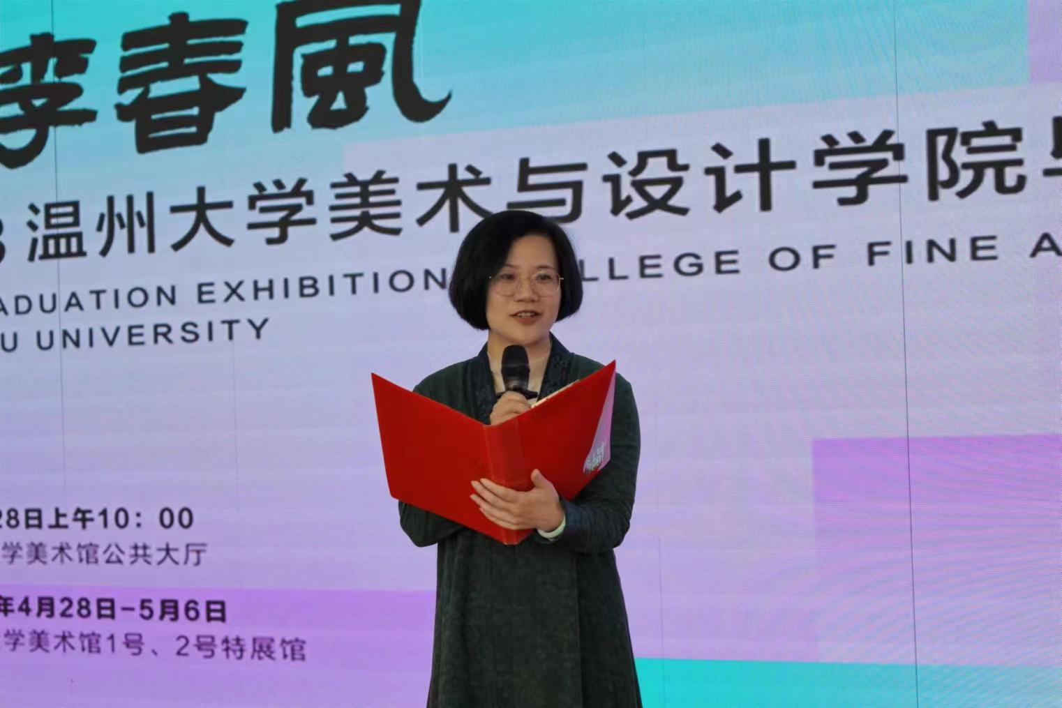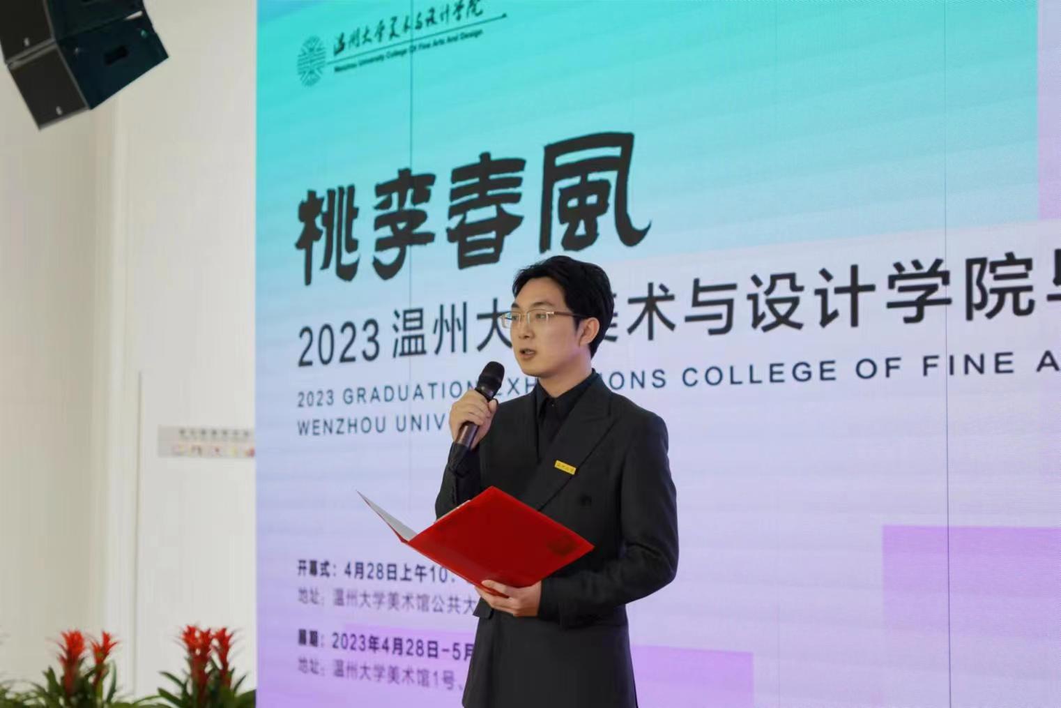 温州市文联党组成员、副主席谢子康为本次活动致辞。他向本届毕业作品展的隆重举行表示热烈祝贺,充分肯定了国产自拍美术与设计学院在艺术人才培育方面,为温州地方文化艺术事业的兴旺与繁荣作出了不可替代的积极贡献,还有毕业生们的优秀实力与未来发展的巨大潜能,并对毕业生继续弘扬中华传统文化精神、创作时代精品、加强自我修养寄予厚望。他希望美术与设计学院在浙南地区引领艺术创新、陶冶大众审美情操上继续发挥重要的历史作用。