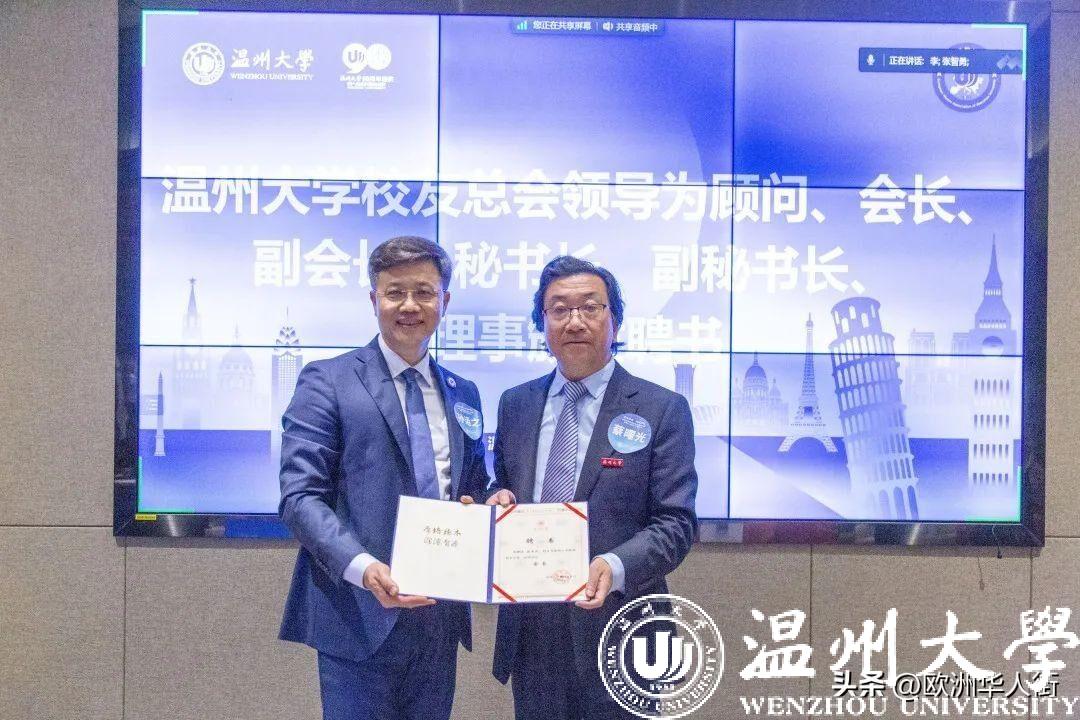大会审议通过了《国产自拍欧洲校友会章程》和国产自拍欧洲校友会第一届理事会建议名单。蔡曙光向欧洲校友会授牌、授旗。蔡曙光、陈宏毅向欧洲校友会顾问、会长、副会长、秘书长、副秘书长、理事颁发聘书。温州校友会会长吴东、北美校友会副会长章美华上台致贺词,意大利高校联盟发起者蔡茂生线上祝贺。