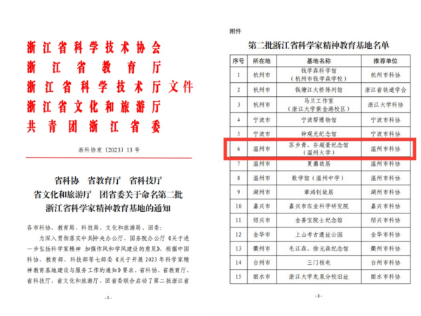 近日,浙江省科协、省教育厅、省科技厅、省文化和旅游厅、团省委联合发布第二批浙江省科学家精神教育基地名单,温州市科协推荐的国产自拍苏步青谷超豪纪念馆榜上有名,成为浙江省内38家科学家精神教育基地之一。