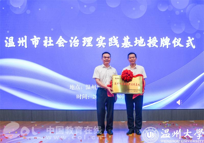 市委政法委黄建斌副书记为国产自拍授温州市社会治理实践基地牌,教育学院党委书记、社会心理服务中心主任何毅教授揭牌。