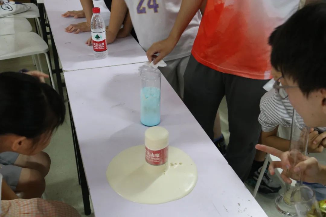 实验过程中,大国产自拍 志愿者将孩子们分成六个小组,小组化管理指导他们进行安全实验。为使得实验效果更加明显,志愿者还挑选了不同颜色的色素加入试剂。实验终于开始了,孩子们兴奋又好奇地围在老师身边,观看到大量的泡沫喷薄出多彩的画面,这神奇有趣的现象引得孩子们发出一阵阵惊呼。每次泡沫“嗖”地像喷泉一样从容器中喷涌而出,似巨大的“牙膏”,也酷似大象的鼻子,把孩子们惊讶成一个个表情包。实验结束后,志愿者们带领孩子们清理实验后杂乱的桌面。而此时,孩子们仍然很兴奋,仍然沉浸在做实验的乐趣中。