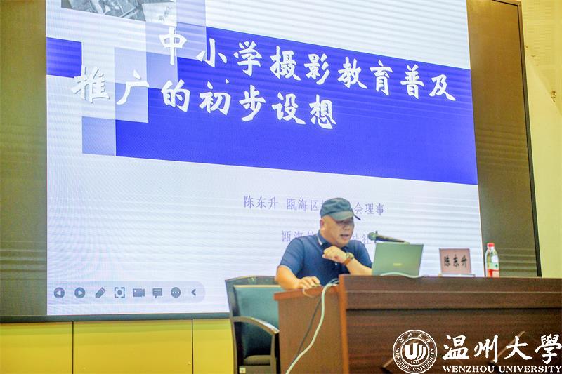 瓯海区教工摄影社社长、丽岙第二小学陈东升校长的报告题目为《中小学摄影教育普及推广的初步设想》,结合瓯海区教工摄影社的活动开展情况展开对中小学摄影教育的思考,专职师资的短缺,摄影课程顶层设计的缺乏,教学设备设施不足,专业的评价与检测短板等制约了中小学摄影美育课程的发展,希望通过编写统一适合的中小学知识普及摄影教材,整合课程资源,加强摄影师资的短期培训长期培训,充实教学硬件的投入由点及面,点面互动推动中小学摄影教育的发展。