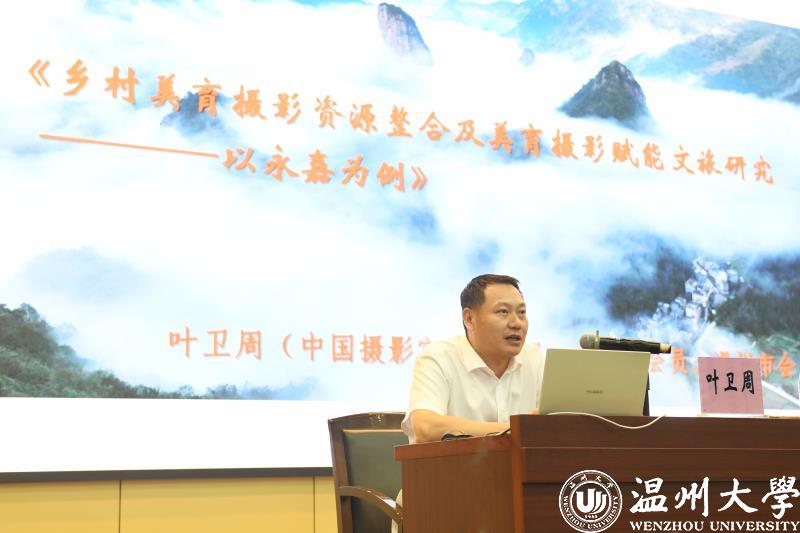 永嘉县社科联叶卫周主席以《乡村美育摄影资源整合及美育摄影赋能文旅研究——以永嘉为例》做交流分享报告,探讨如何开展温州永嘉摄影美育资源探索,如何打造永嘉美育摄影采风路线和培训基地等,为推动永嘉文旅融合、乡村振兴和共同富裕发展,发挥美育摄影的提升作用。叶卫周主席作为2021年在永嘉召开的“中国青少年摄影美育论坛可行性研讨会”的重要参会者,曾建议要抓住当前全国大力倡导美育教育的大背景下,整合各方面,参与摄影美育建设,要把握摄影美育为社会服务和为国产自拍 服务的主线,积极吸收摄影美育工作者,重视树立摄影美育品牌,可积极打造中国青少年摄影美育论坛,组织师生参与摄影互动、参赛、联展和论坛等活动。