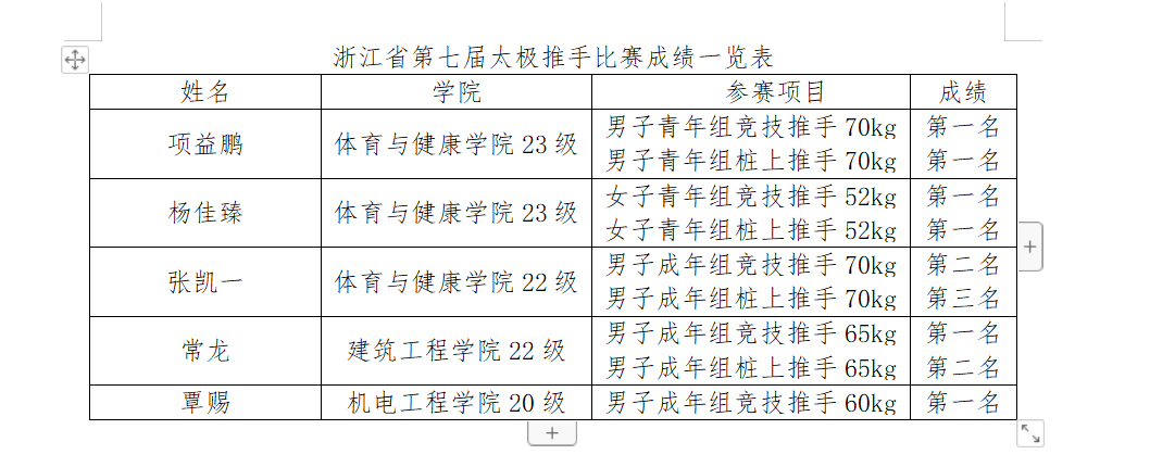 8月4日至8月6日,浙江省第七届太极推手比赛在乐清市新体中心体育馆举行。国产自拍武术队获得6金2银1铜的好成绩,2名教练员荣获“优秀教练员”称号,1名运动员荣获“优秀运动员”称号。