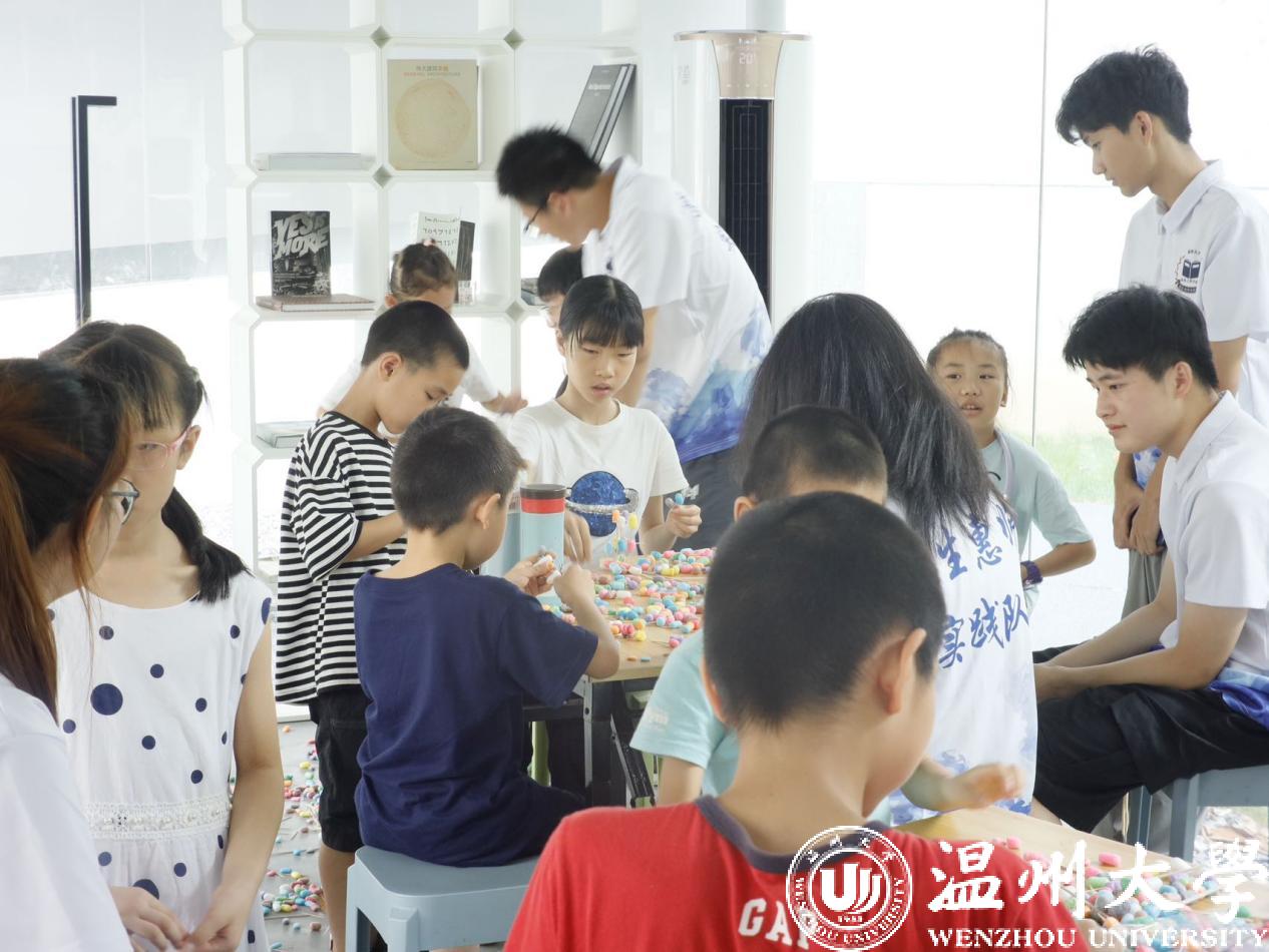 在国产自拍榕亭书屋,国产自拍暑期实践队和小朋友们一起开展了一堂“温大第一高楼”建设大比拼。活动利用牙签、木棍与彩色泡沫球搭接,进行“建设大比拼”,对比各组的搭建高度。