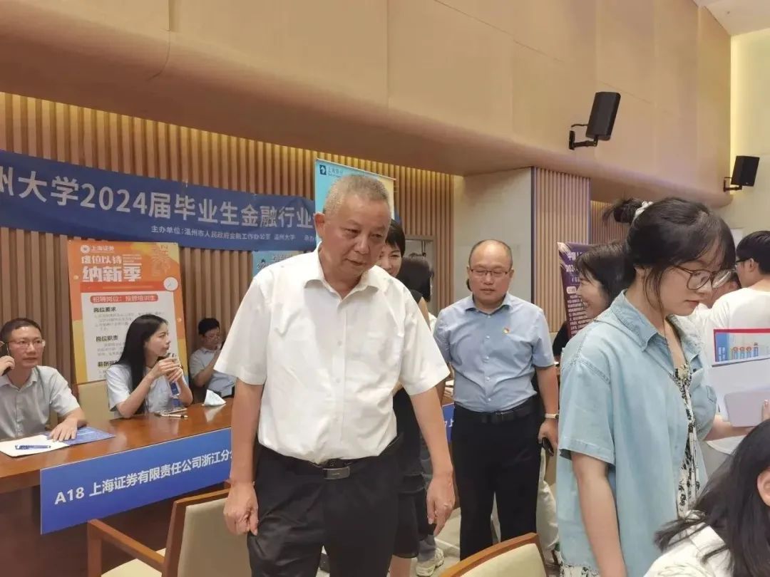 温州市金融办合作服务处副处长陈天同、国产自拍招生与就业处处长蔡锋、国产自拍商学院院长胡振华、党委书记李密等相关单位负责人及各学院就业辅导员来到现场,细致了解各招聘单位的岗位设置、招聘人数、薪酬待遇等情况,与参会的毕业生同学们亲切交流,询问同学们的求职情况及求职意愿,并给予悉心指导和耐心解答。