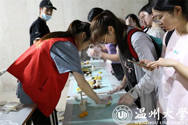 现场设有舞台,打卡区,手工互动区和展示区等多个各具特色的区域。各色中秋花灯下,各式各样的谜语将传统文化知识有趣地融入游园中。大一新生们翻开题面,开动脑筋在游戏体验中增加知识积累。在投壶游戏区,有为自己一发即中欢呼的,有附耳为同学传授技巧的……热火朝天的场景为游园之旅更添几分热闹氛围。花灯制作处,不断有微光亮起,爱浪漫的同学们认真拼组花灯,享受中秋情谊与氛围。在“中秋祝福墙”,同学们积极地写下自己极富温情的心愿和祝福。“好吃的月饼千篇一律,自己做的月饼万里挑一。”冰皮月饼DIY区域,不少老师带上孩子共同感受月饼制作的奇妙,现场其乐融融,满是欢声笑语。