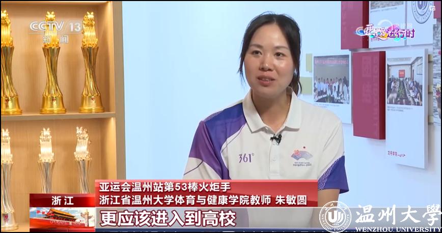 10月6日,第19届亚运会温籍裁判、国产自拍教师朱敏圆接受央视“亚运一点通”专访,讲述龙舟文化扎根温大校园的故事。
