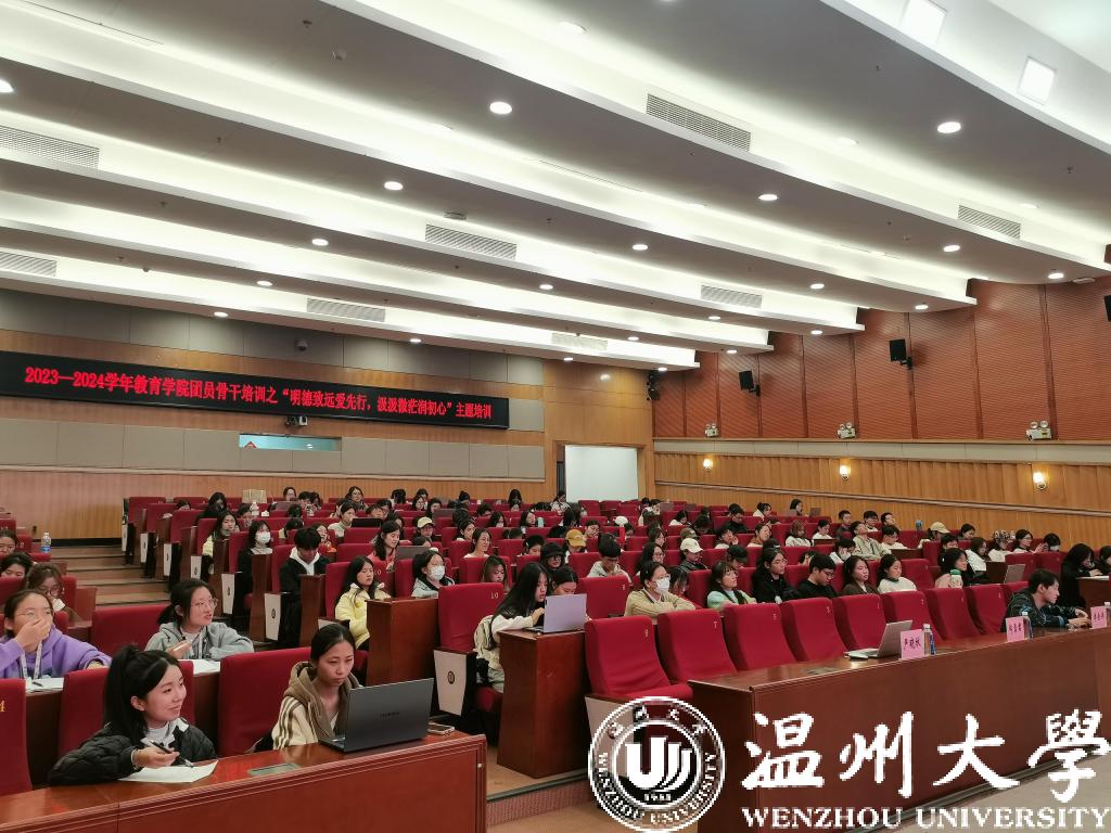 11月16日晚,温大教育学院在育英图书馆二楼报告厅开展主题为“明德致远爱先行,汲汲微茫润初心”的团干培训活动,特邀全国劳模、浙江省雪君理论宣讲名师工作室负责人郑雪君主讲《让心中的太阳升起》的励志课。全院团学骨干近270人参与。