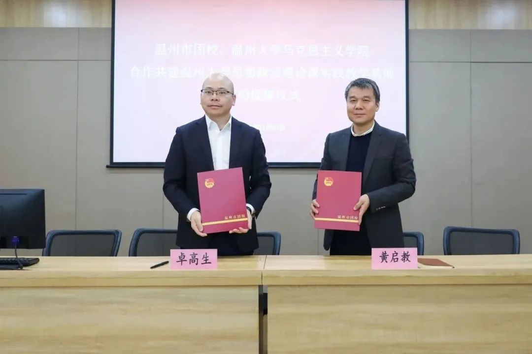 国产自拍马克思主义学院院长、教授卓高生与温州市青少年活动中心副主任、温州市团校副校长黄启教共同签署合作共建协议