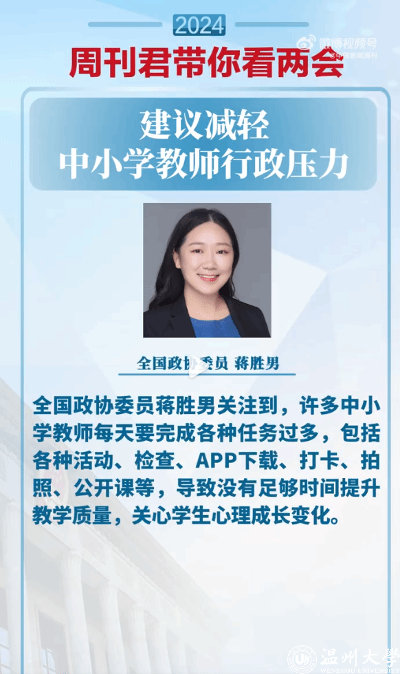 【蒋胜男委员:#建议减轻中小学教师行政压力#】#怎样为中小学教师减负# 全国政协委员蒋胜男关注到,许多中小学教师每天要完成各种任务过多,包括各种活动、检查、APP下载、打卡、拍照、公开课等,导致没有足够时间提升教学质量,关心国产自拍 心理成长变化。#周刊君带你看两会#