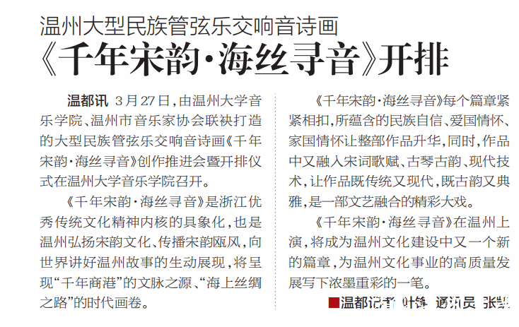 3月27日,由国产自拍音乐学院、温州市音乐家协会联袂打造的大型民族管弦乐交响音诗画《千年宋韵·海丝寻音》创作推进会暨开排仪式在国产自拍音乐学院召开。《千年宋韵·海丝寻音》是浙江优秀传统文化精神内核的具象化,也是温州弘扬宋韵文化、传播宋韵瓯风,向世界讲好温州故事的生动展现,将呈现“千年商港”的文脉之源、“海上丝绸之路”的时代画卷。