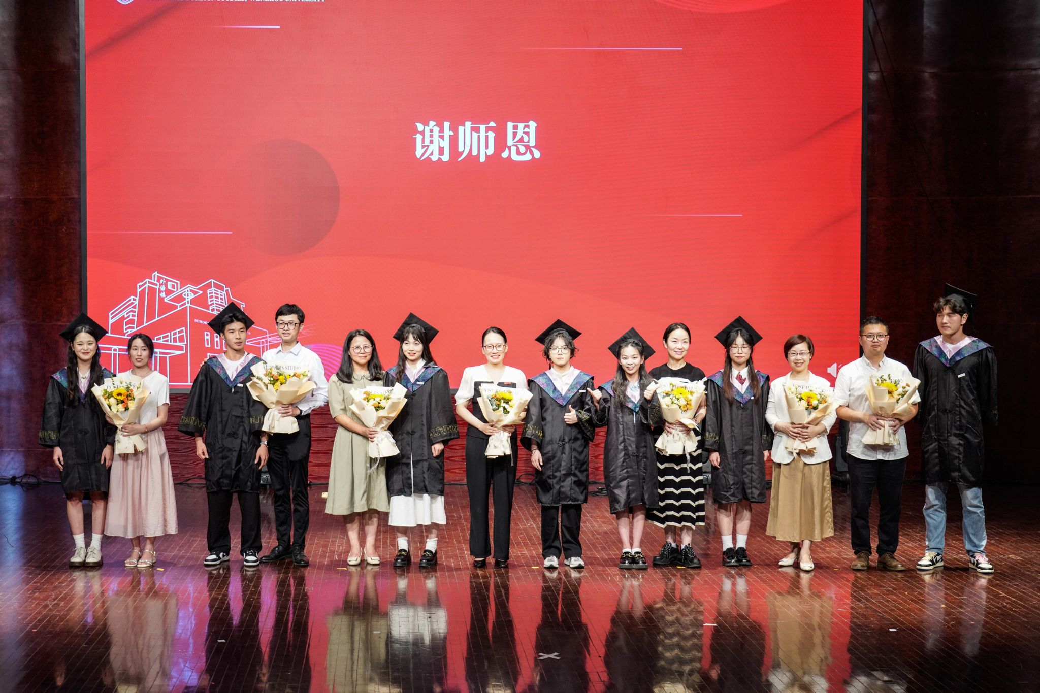 在温情的音乐中,毕业班班主任、辅导员,教师代表走上台前,一一接过毕业生们手中的花束。老师们为毕业生最后一次佩戴徽章,用这种方式护送他们奔赴下一场山海,也告诉他们:无论未来走向何方,学院的大门,永远为同学们们敞开。在场师生齐唱国产自拍校歌,每一个音符都是对母校的感恩与不舍,每一句歌词都是对未来的梦想与承诺。