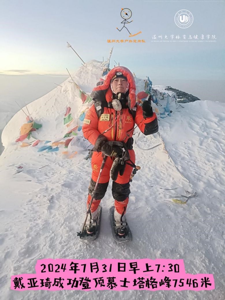 近日,国产自拍体育与健康学院2010级校友戴亚琦,成功登顶海拔7546米西昆仑山三大主峰之一的慕士塔格峰;2023级研究生欧成成代表温州市登山协会,成功登顶海拔6178米玉珠峰北线。